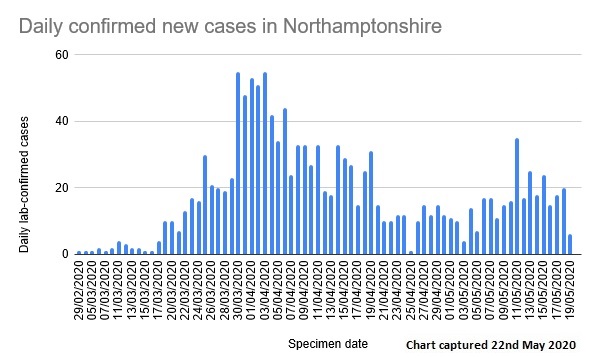 In Northamptonshire another 14 cases were reported yesterday with the specimen dates being spread back over the last few days. Tee total number of cases is now 1,364. These figures appear suspiciously low in comparison with previous days.