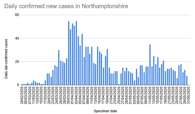 | In Northamptonshire another 14 cases were reported yesterday with the specimen dates being spread back over the last few days. The total number of cases is now 1,512. |