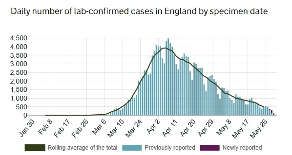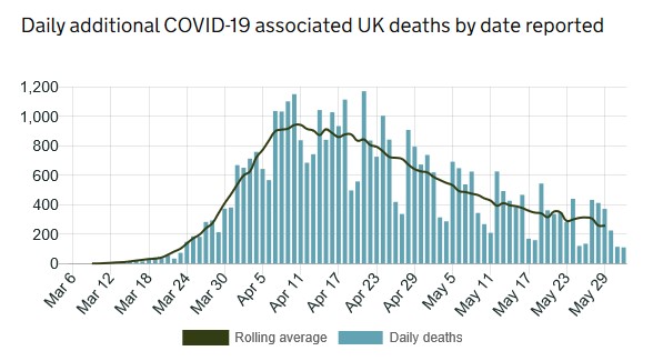 | 111 deaths were reported by the Government yesterday taking us to 39,045 across the UK. The numbers of new daily infections decreased to 1,570. Both of these figures reflect the usual weekend reporting blip. |