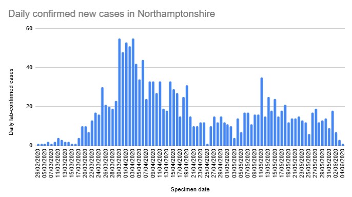2 new infections were reported in East Northamptonshire yesterday, the highest in Northamptonshire again. However, look at the data from Bedford. This is data reflects two missing days on the 1st and 2nd June. However, it is still a serious problem.
